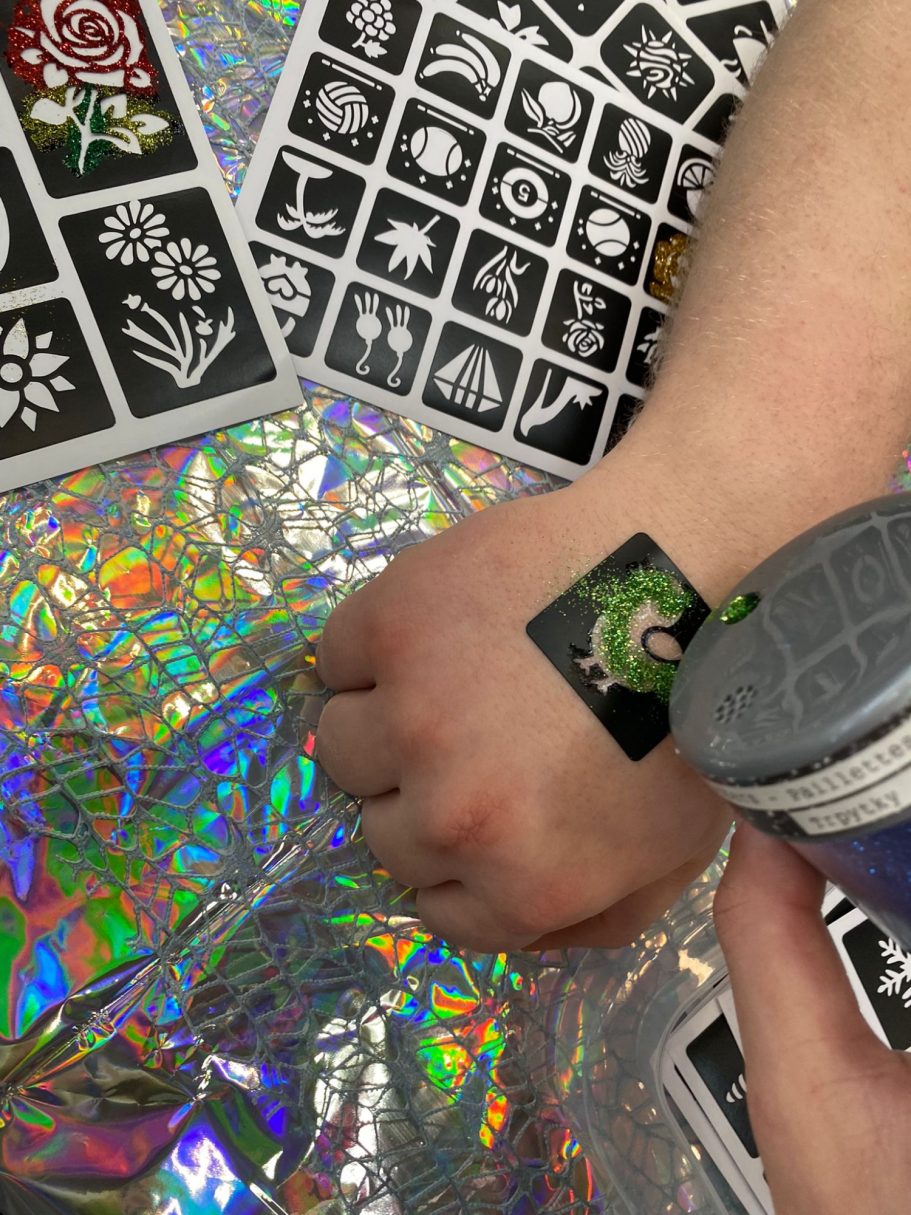Bei uns gibt es neben guter Laune und netten Gesprächen auch immer ein Glitzer-Tattoo Tisch, sowie Merchandise.